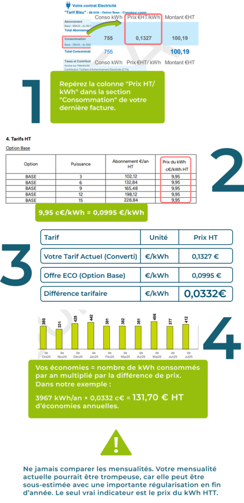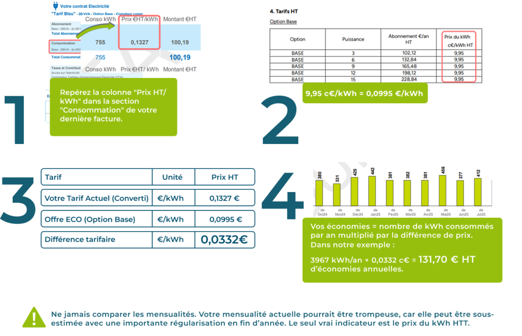 Ne jamais comparer les mensualités. Votre mensualité actuelle pourrait être trompeuse, car elle peut être sous-estimée avec une importante régularisation en fin d’année. Le seul vrai indicateur est le prix du kWh HTT.